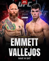 | Experience | UFC: 10-6; former #1 contender | UFC: 3-0; fast riser | Emmett’s veteran savvy vs. Vallejos’ unbeaten UFC streak and youth. |